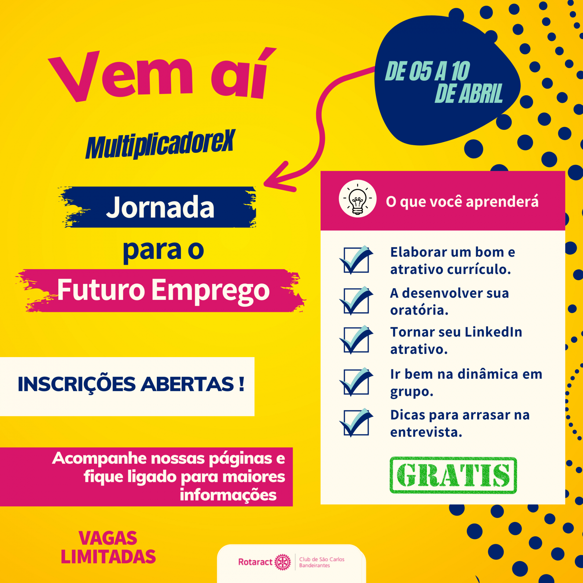 O Rotaract Club-Bandeirantes São Carlos 4540 elaborou o projeto MultiplicadoreX - Jornada para o Futuro, um curso Gratuito preparatório para Processos Seletivos para quem está à procura do primeiro emprego ou reposicionamento no mercado de trabalho.